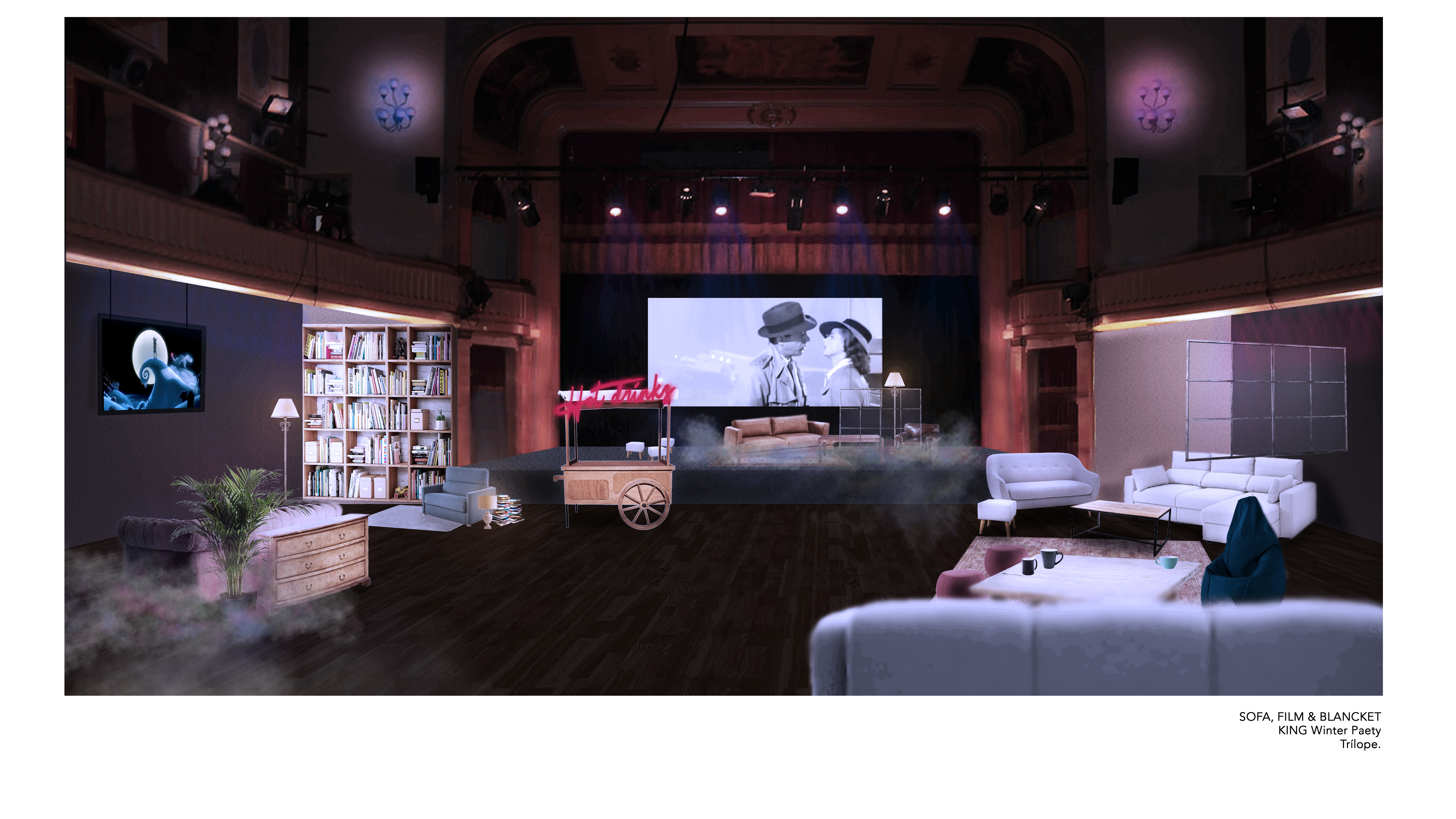 Proyecto de diseño de una escenografía para una conocida marca de videojuegos. La intención de esta propuesta es crear un espacio festivo donde la barrera de la realidad y los sueños se difumina. Un lugar situado en esos días de invierno cuando te estás quedando dormido mientras ves una película y te arropas con una manta para protegerte del frío.